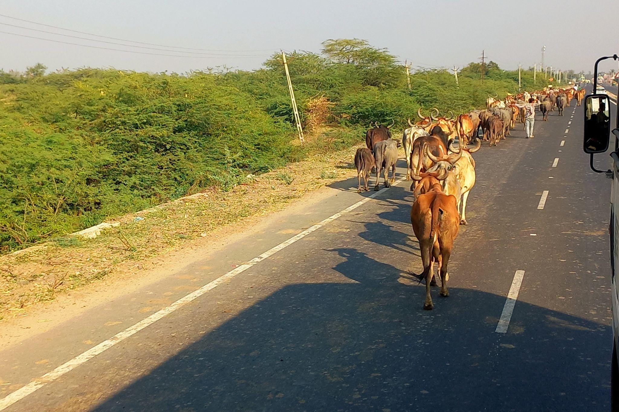A shepherd stands at a distance with a stick in his hand and a beedi in the other, watching this. A regular episode. The driver looks at him, and the shepherd looks back. He has seen a lot of egos from a distance. He lets a few 100 goats cross the road to add complexity to the situation and then smiles.
